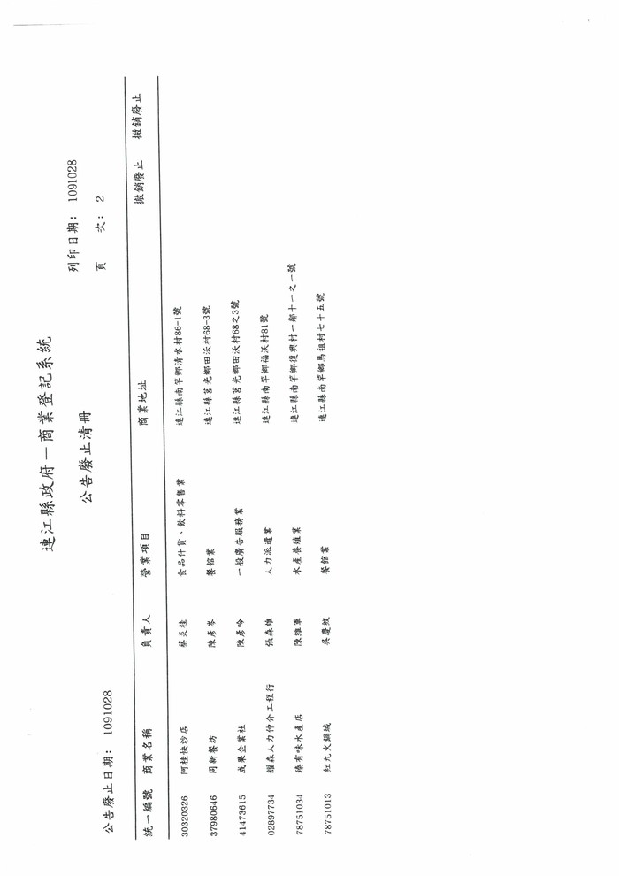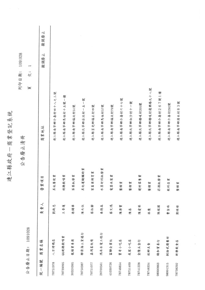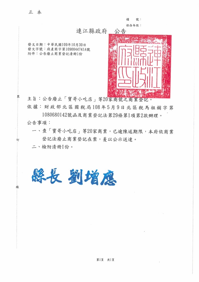 公告廢止本縣20家商號之商業登記