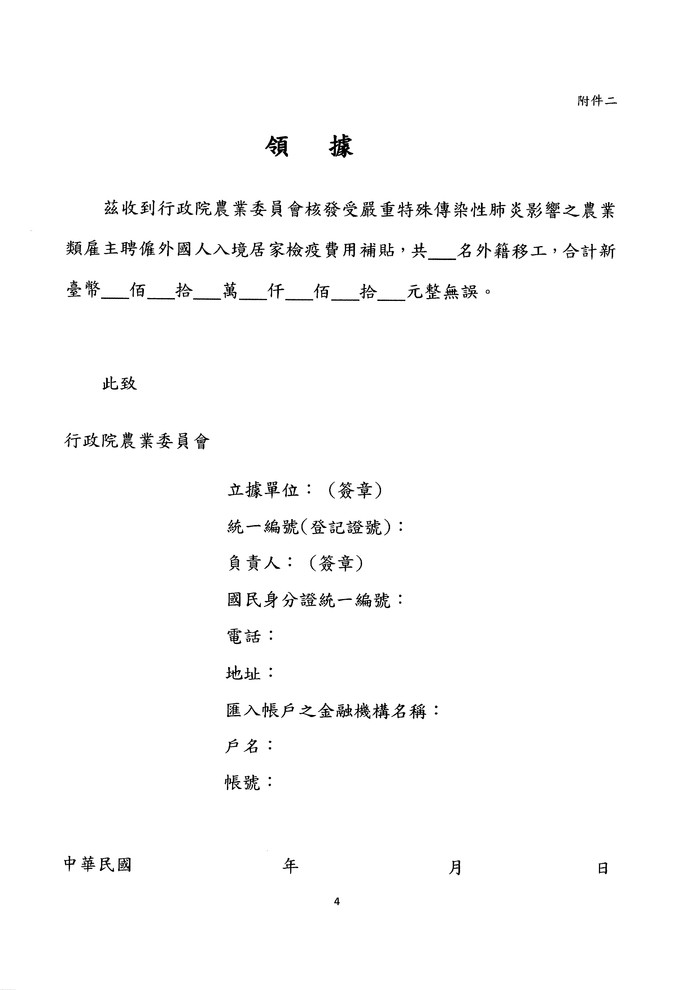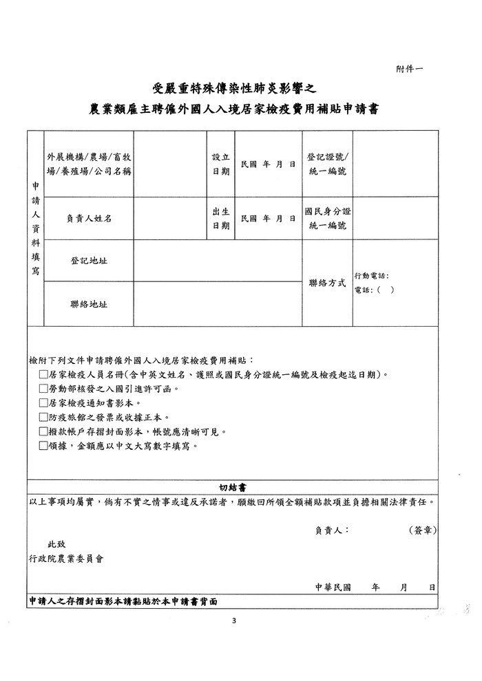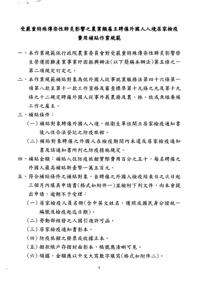受嚴重特殊傳染性肺炎影響之農業類雇主聘僱外國人入境居家檢疫費用補貼作業規範