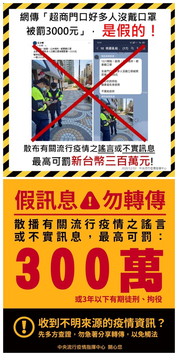 有關民眾12/2於通訊軟體及社群媒體流傳「12/1開始,超商、公共場所都要戴口罩,好多人因沒戴口罩,警察於某超商門口開罰單~3000元」等訊息為不實訊息,請民眾勿轉傳。
