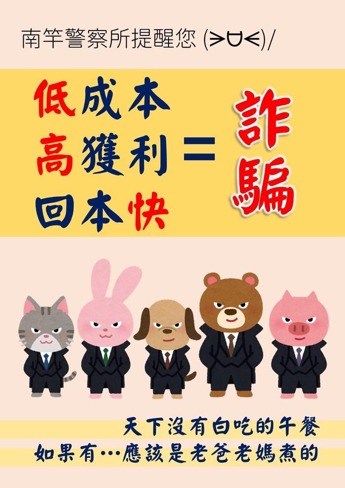 如「短期投入」、「穩賺不賠」、「老師專業帶盤」、「虛擬貨幣」等,