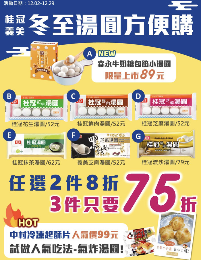 冬至將近,桂冠湯圓3盒75折,在➕10%折扣,3盒就只要105元