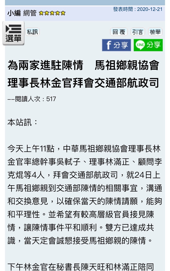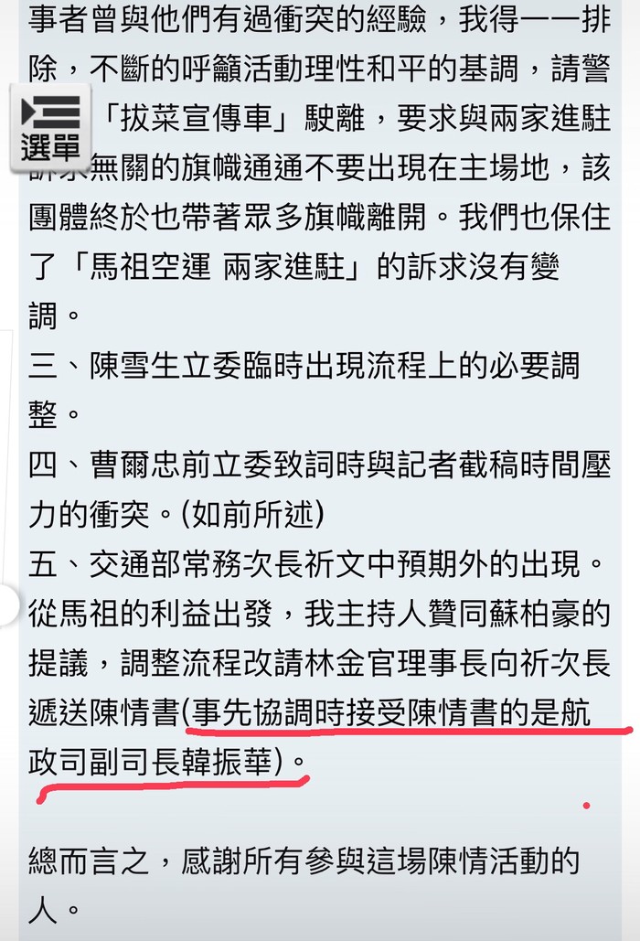 首先感謝的是民進黨連江縣黨部主委李問協助這場“馬祖空運 兩家進駐”的陳情活動,李問主委在林金官理事長的請託下,協助安排了週一上午在交通部陳情的會前會,確認了遞交陳情書的相關事宜,會中敲定原則上由副司長代表接受陳情,後續再臨機應變。馬祖日報也隨即有相關報導,但沒有報導到詳情,十分可惜。