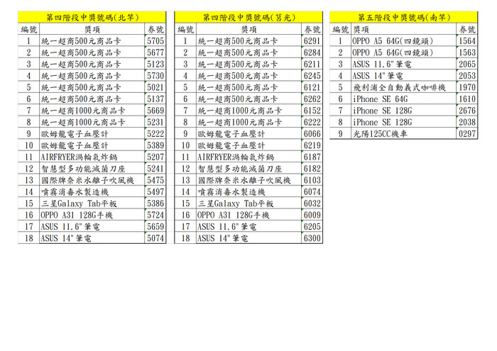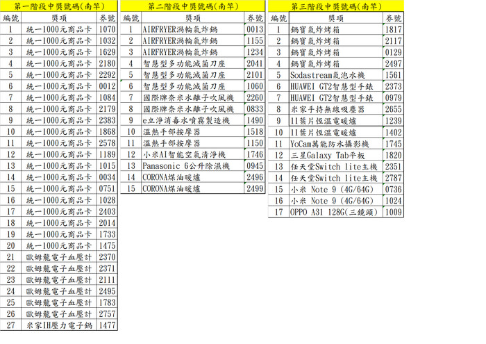 恭喜以下得獎者;北竿鄉、莒光鄉得獎者彩品,將由承辦單位以郵寄或宅配方式寄送至摸彩券「抽獎聯」所填寫之住址;南竿鄉得獎者請於110年1月6日17時前,憑摸彩券「存根聯」及身分證明文件至交通旅遊局(南竿鄉清水村101號3樓)領取彩品,逾時未領取得獎彩品者視同放棄獲獎資格。