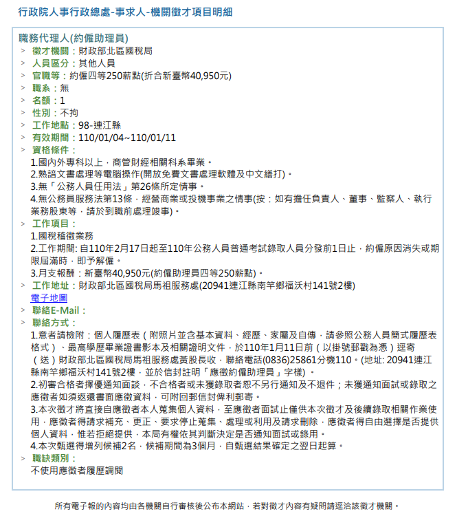 財政部北區國稅局馬祖服務處徵才約僱助理員