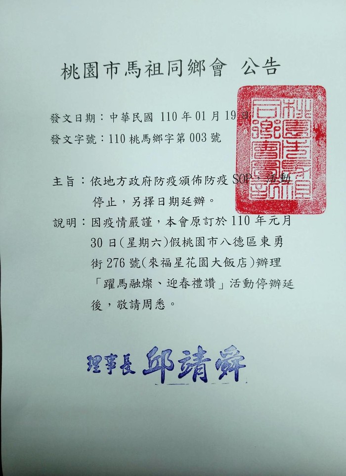 桃園馬祖同鄉會1/30餐會活動停辦延後