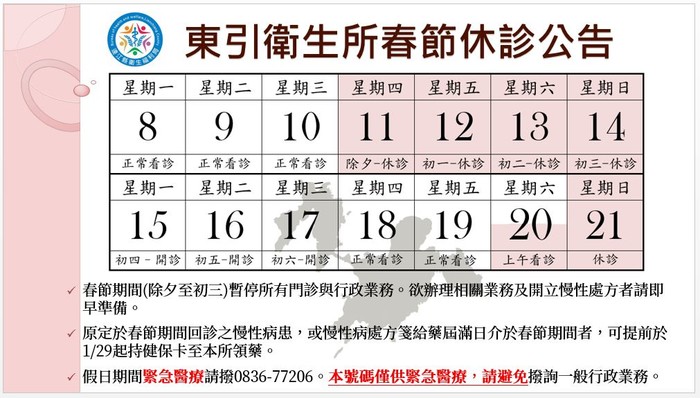 東引衛生所將於除夕(2/11)至初三(2/14)連續休診4日,期間僅提供緊急醫療服務,欲辦理相關業務及開立慢性處方者請即早準備。