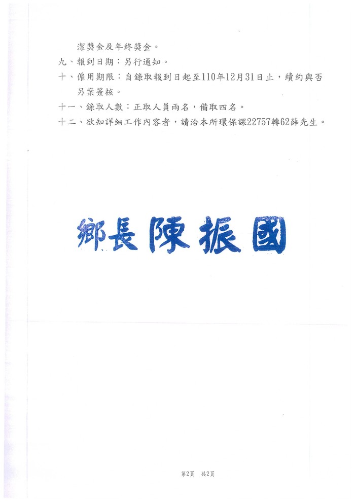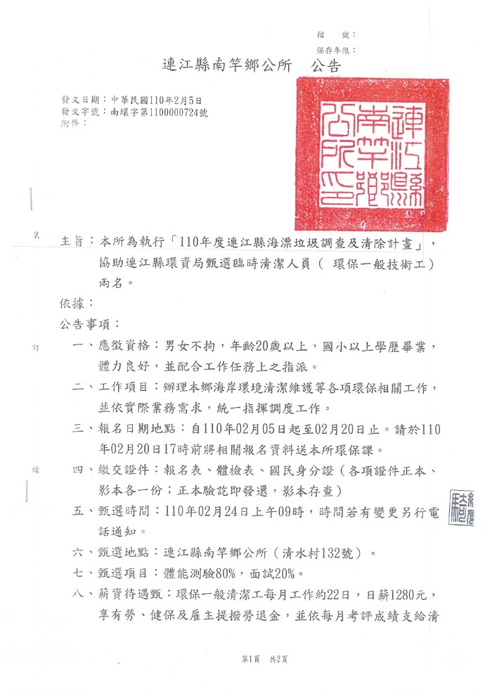 南竿鄉公所代環資局甄選環保臨時工兩名
