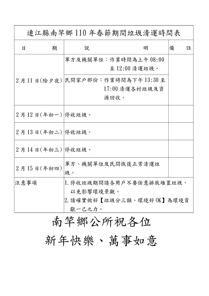 南竿鄉2月15日恢復正常收垃圾