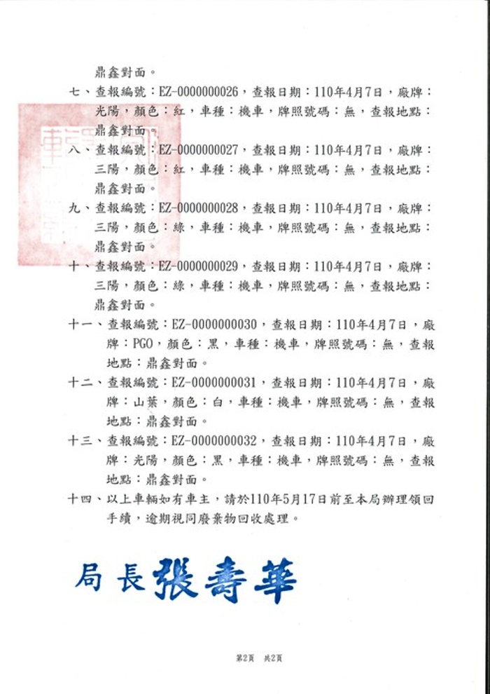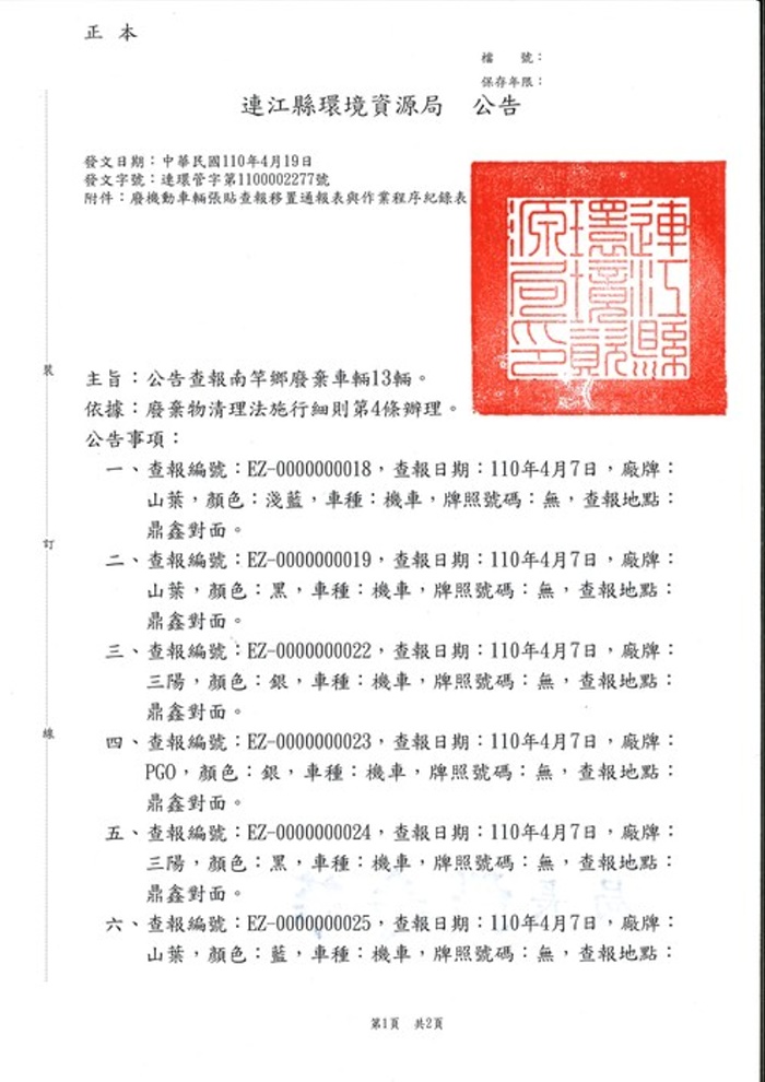 公告查報南竿鄉廢棄車輛13輛