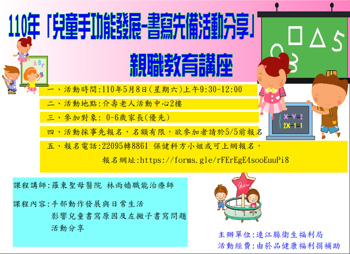 三、參加對象:0-6歲家長(優先),活動採事先報名,名額有限,,欲參加者請於5/5前報名,報名電話:22095轉8861 保健科方小姐或可上網報名,報名網址:https://forms.gle/rFErEgE4sooEuuPi8