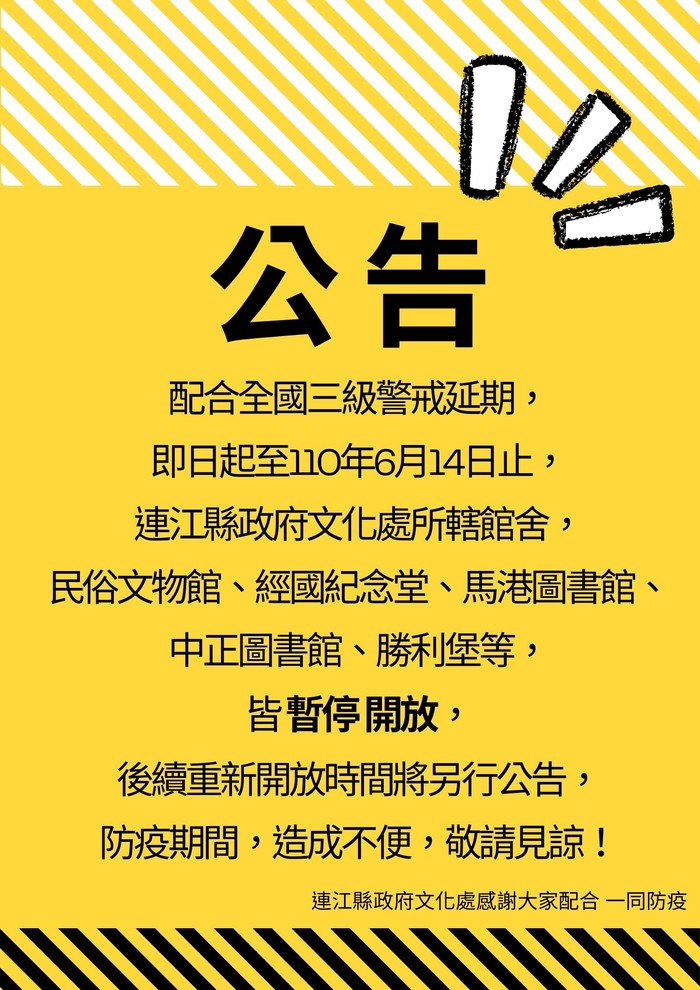 民俗文物館、經國紀念堂、馬港圖書館、中正圖書館、勝利堡等,皆暫停開放,後續重新開放時間將另行公告,防疫期間,造成不便,敬請見諒!