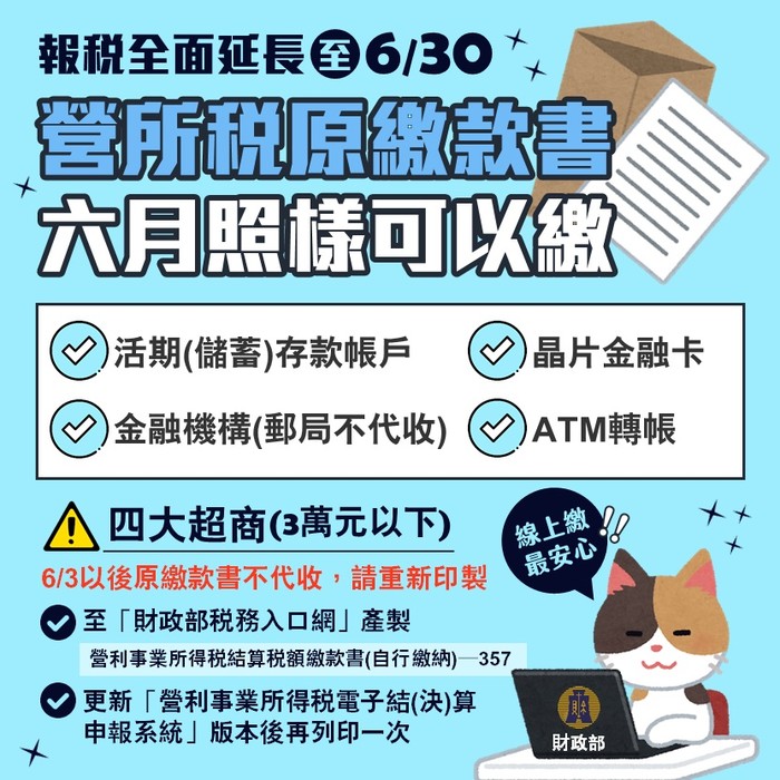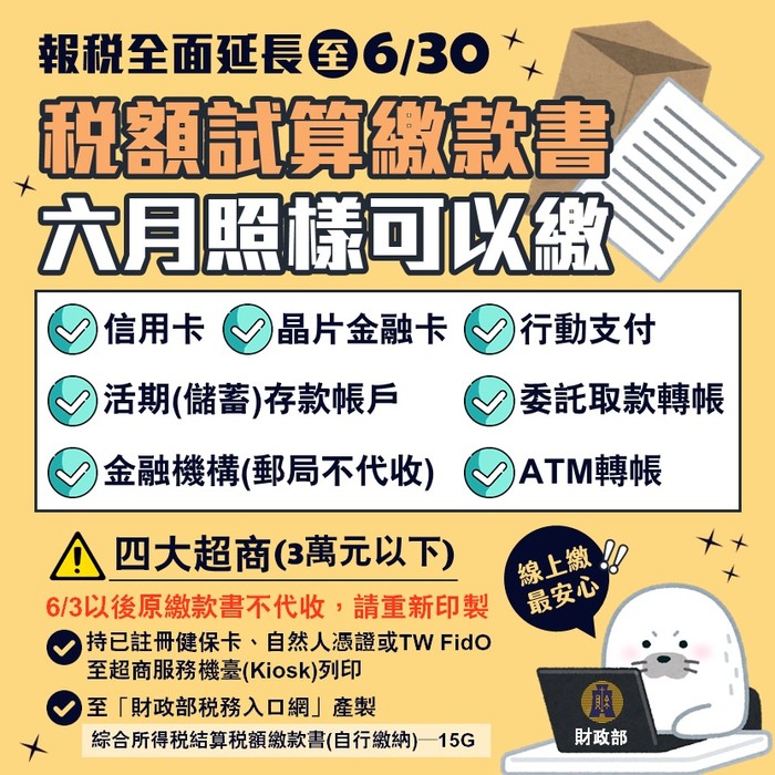 注意!!!原繳款書(3萬元以下)6月3日以後,四大超商不代收,需重新印製,或至金融機構(郵局不代收)繳納~