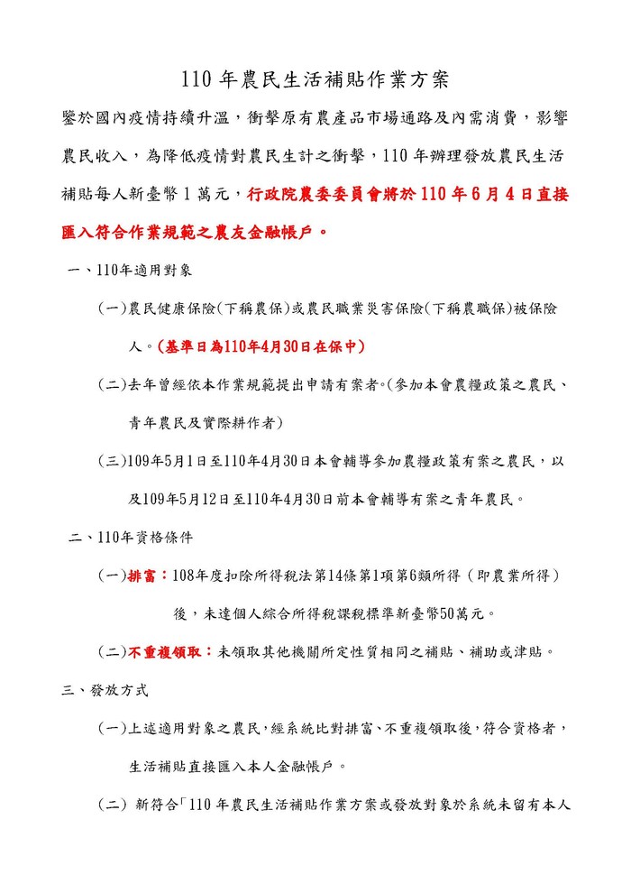 ~110年農民生活補貼作業方案~