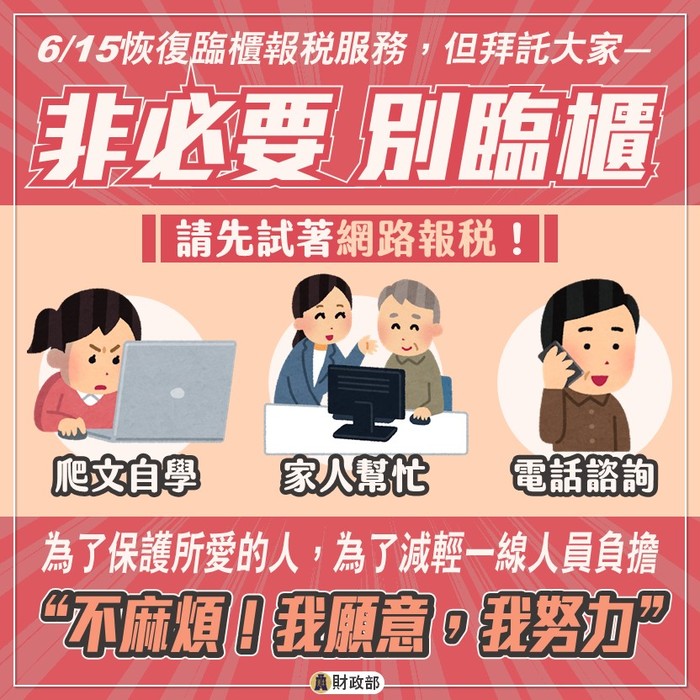 非必要別臨櫃,要前往先預約! --閱讀人次 : 1130 6/15起,國稅局恢復臨櫃報稅服務,真的沒辦法網路報稅的民眾再行前往,請先提前線上或電話預約,儘量減少現場停留時間,為了保護自己與他人健康,煩請配合!