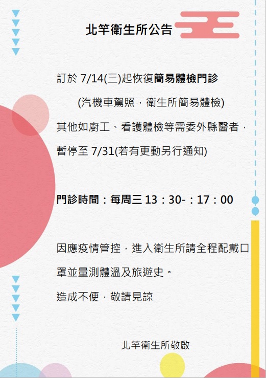 北竿衛生所7/14起恢復簡易體檢
