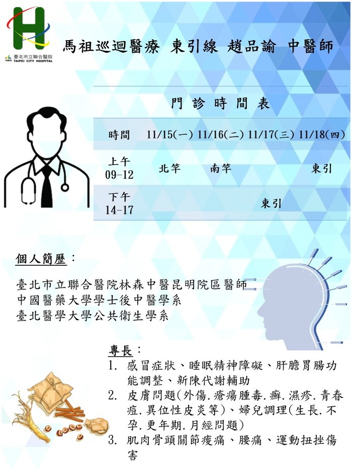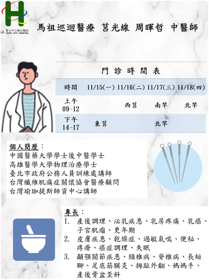 馬祖中醫巡迴醫療服務11/15-18由東引線 趙品諭醫師、莒光線 周暉哲醫師前往支援,請大家多多利用,看診時記得全程戴口罩喔!