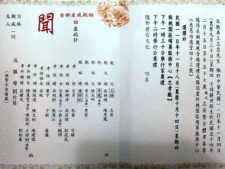 王志忠先生11/18桃園舉行公祭