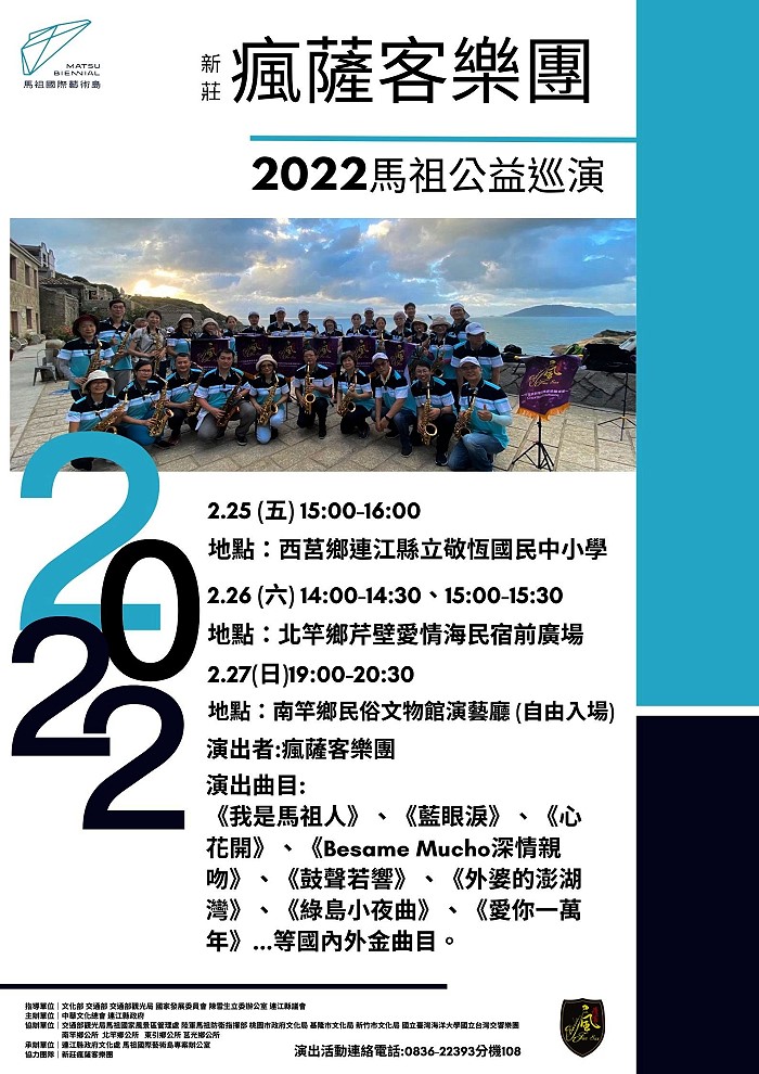 【記者曹重偉報導】馬祖國際藝術島表演系列活動魅力燃燒,本週將由連江縣政府邀請新莊「瘋薩客樂團」抵馬薩克斯風公益巡演,預定2月25日至27日進行3場跳島巡迴演出,分別是25日莒光鄉敬恆國民中小學、26日北竿鄉芹壁村及27日南竿鄉民俗文物館演藝廳,難得有國內演奏家及歌手到場演出,歡迎愛好音樂人士共度美好時光,一同來感受到音樂的美好。