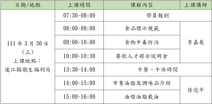(2)課程時間:3/30 7:30報到,8:00-10:30共2堂課+餐飲人才人力媒合說明會,共計2.5小時