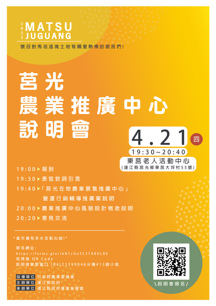 「莒光在地農業展售推廣中心」營運行銷輔導推廣案說明會將擬定111年4月21日晚上7點,於東莒老人活動中心(連江縣莒光鄉東莒大坪村55號)1樓會議廳辦理相關說明會,敬邀各地鄉親關心地方事,踴躍參予並提出相關意見。