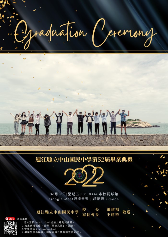 本校110學年度畢業典禮,訂於6月17日(星期五)上午10:00假本校羽球館舉行。由於疫情關係,本次典禮僅邀請畢業班學生及家長參加,不另邀請貴賓。當日所有進場家長皆須於畢典當天自行進行快篩,並於九點前回傳『快篩證明』,確認為陰性方可到校及進場,並全程配戴口罩,請配合本校防疫措施,造成不便,敬請見諒!