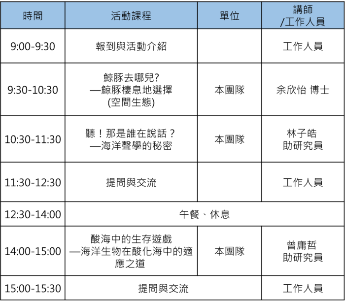 包含 鯨豚棲息地選擇、水下的聲音、酸海中如何求生存 等精實課程,