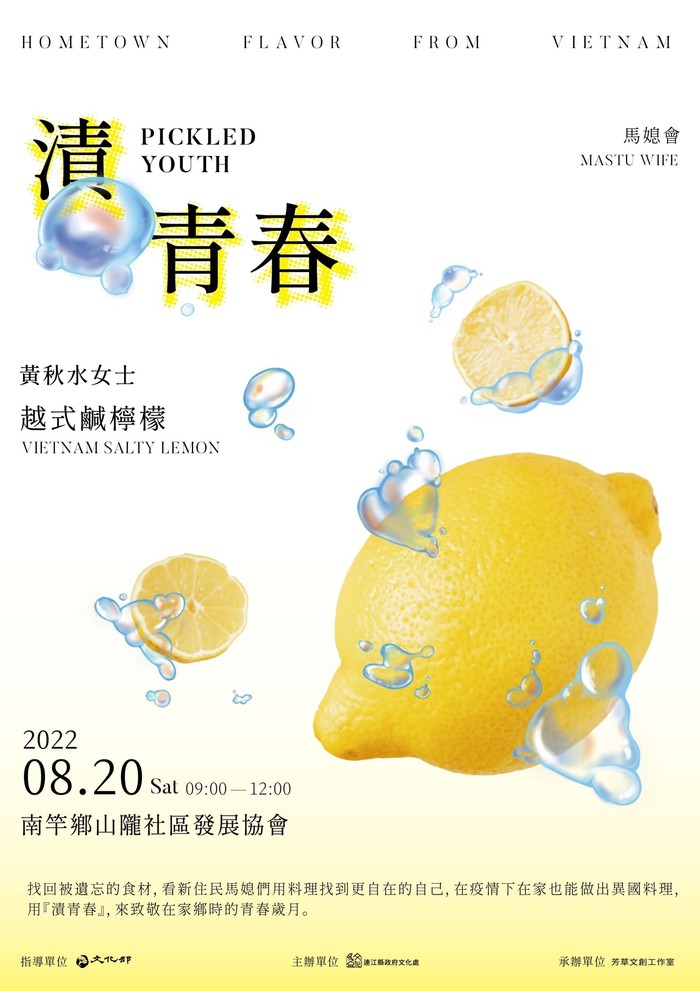馬媳『漬青春』第一場次 --閱讀人次 : 931 找回被遺忘的食材,看新住民馬媳們用料理找到更自在的自己,在疫情下在家也能做出異國料理,用『漬青春』,來致敬在家鄉時的青春歲月。活動時間訂於 111年 8 月 20 日(星期六)上午 9:00-12:00,第一場活動邀請來自越南的黃秋水女士教授「越式鹹檸檬」,酸酸甜甜的口感最適合炎炎夏日解暑、止咳的家鄉密技配方。