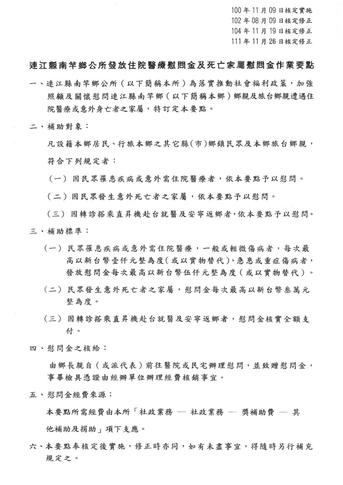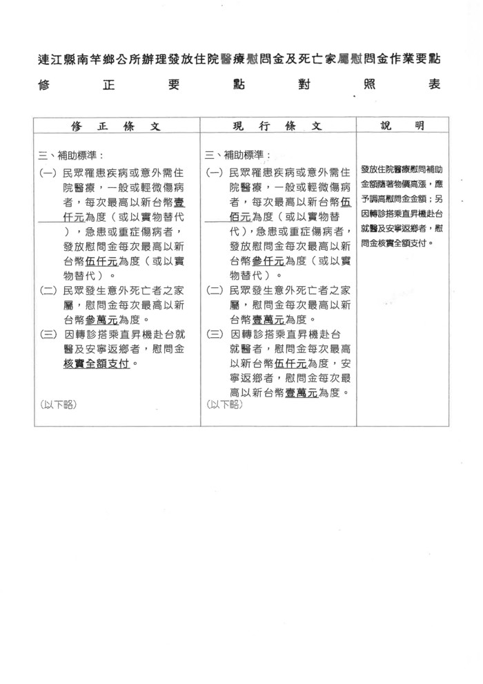 南竿鄉住院醫療及死亡慰問金要點修正