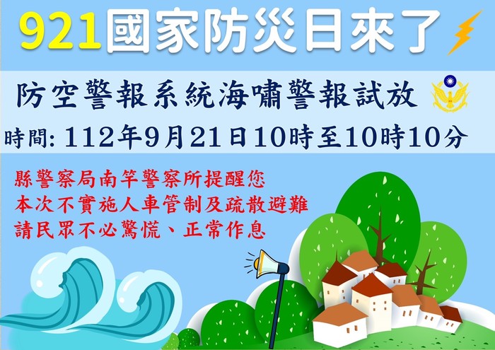112年9月21日10時至10時10分將『運用防空警報系統進行海嘯警報試放』不實施人車管制及疏散避難,請民眾不必驚慌。