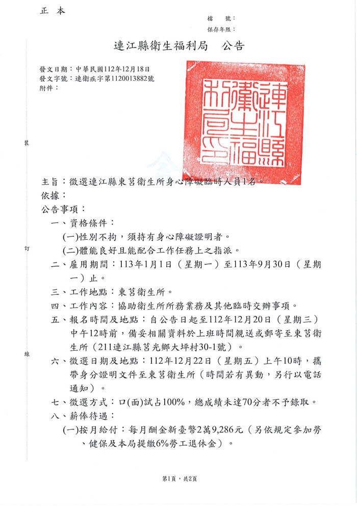 甄選東莒衛生所身心障礙臨時人員1名