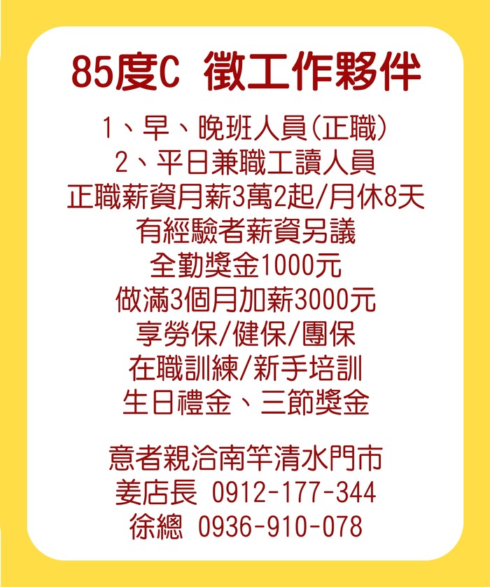 85度C咖啡烘焙誠徵正職、兼職工作夥伴~