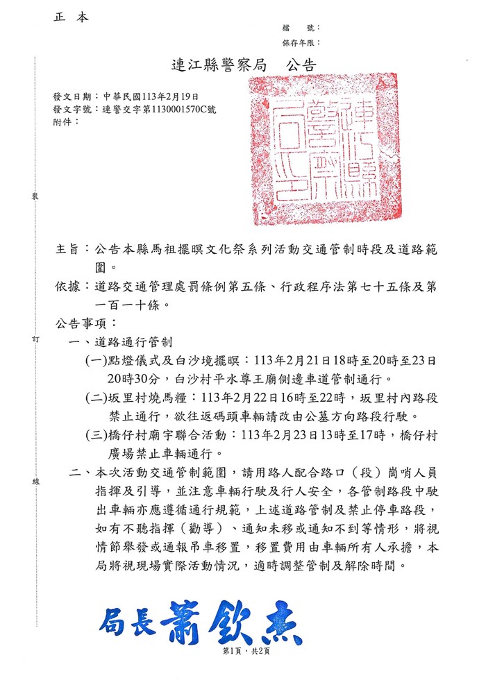113年馬祖擺暝文化祭交通管制公告