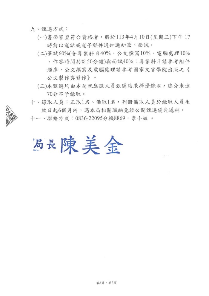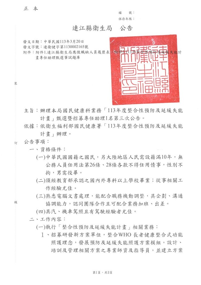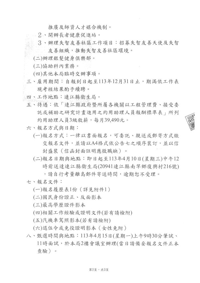 本局國民健康科甄選專任助理1名(報名至4/10中午12點)