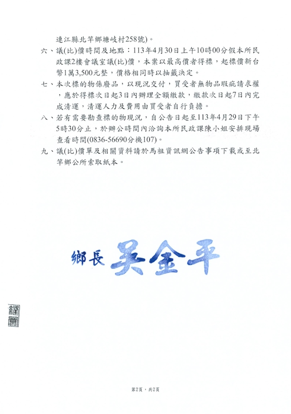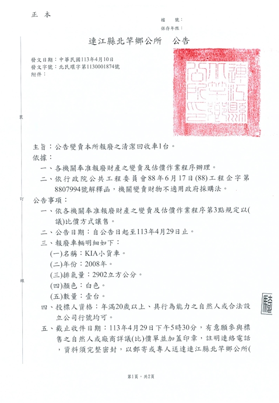 北竿鄉公所報廢之清潔回收車變賣公告