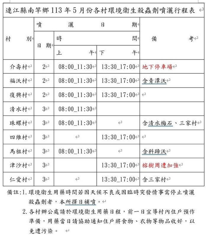 南竿鄉5月份各村殺蟲劑噴灑行程表