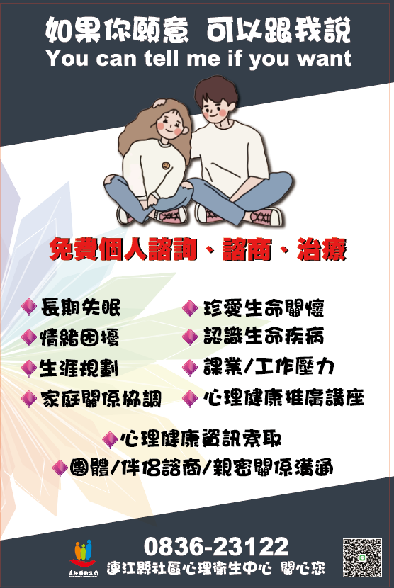 有關心衛中心任何疑問可撥打連江縣社區心理衛生中心專線(0836)23122。