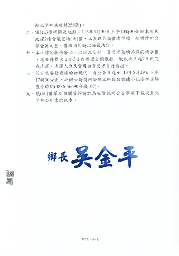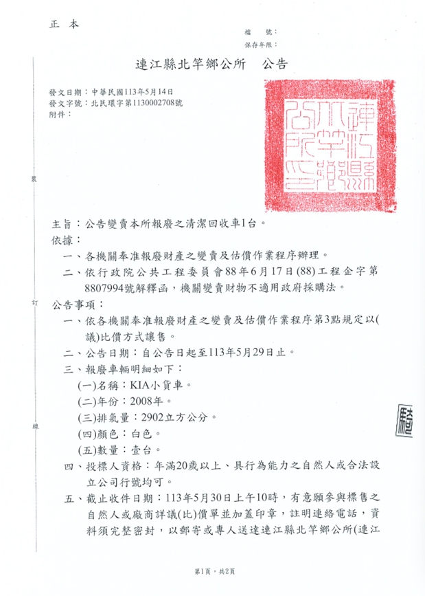 北竿鄉公所報廢之清潔回收車變賣公告