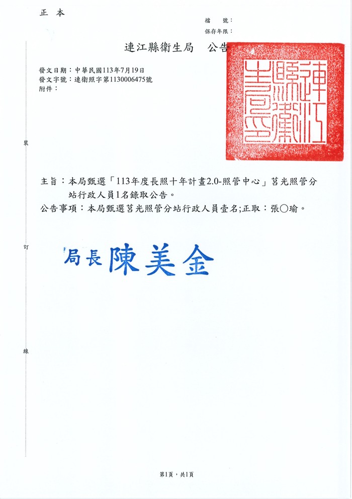 連江縣衛生局甄選莒光照管分站行政人員1名錄取公告