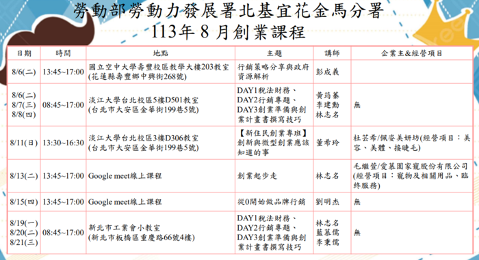 有關原訂7/25日創業課程,因凱米颱風影響課程延期為8/6日,不便之處,敬請見諒!
