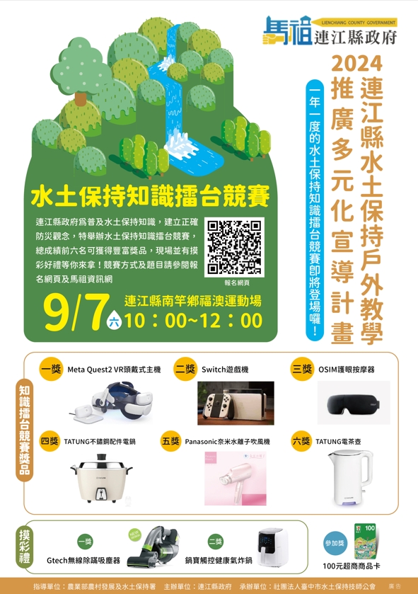 一年一度的水土保持知識擂台競賽即將登場囉!!連江縣政府為普及水土保持知識,建立正確防災觀念,特舉辦水土保持知識擂台競賽,總成績前六名可獲得豐富獎品,現場並有摸彩好禮等你來拿!!