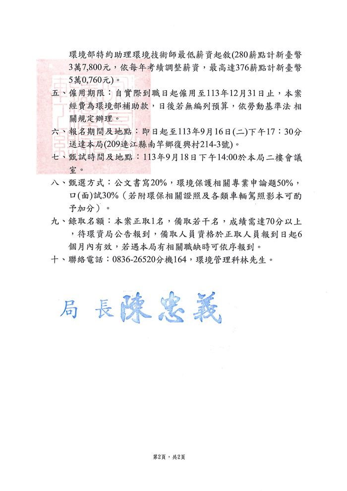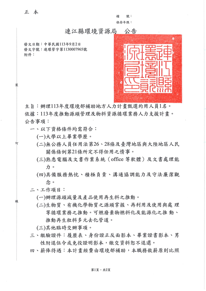 五、僱用期限:自實際到職日起僱用至113年12月31日止,本案 經費為環境部補助款,日後若無編列預算,依勞動基準法相關規定辦理。