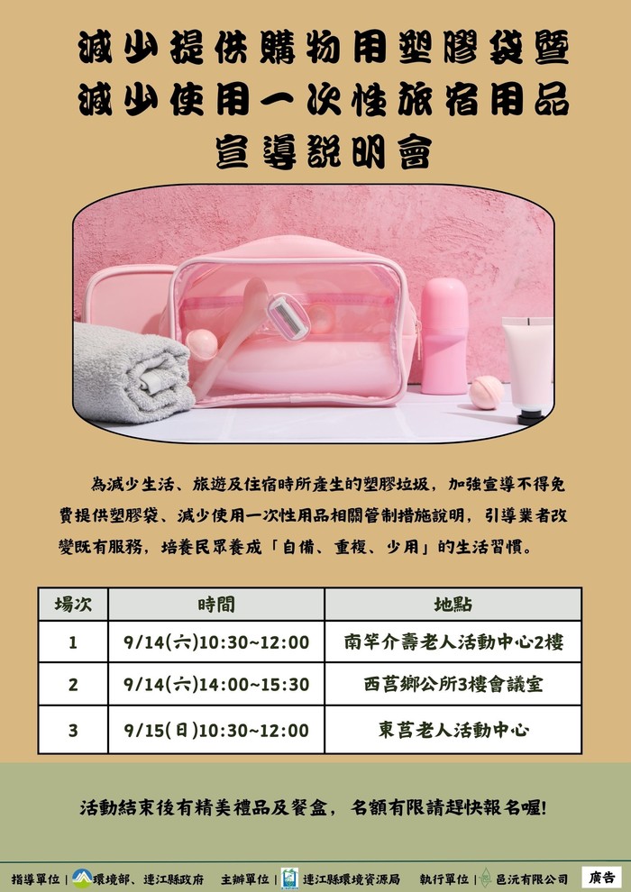 源頭減量購物塑膠袋暨一次性旅宿品說明會 --閱讀人次 : 704 減少提供購物用塑膠袋暨減少使用一次性旅宿用品說明會 四鄉五島巡迴宣導