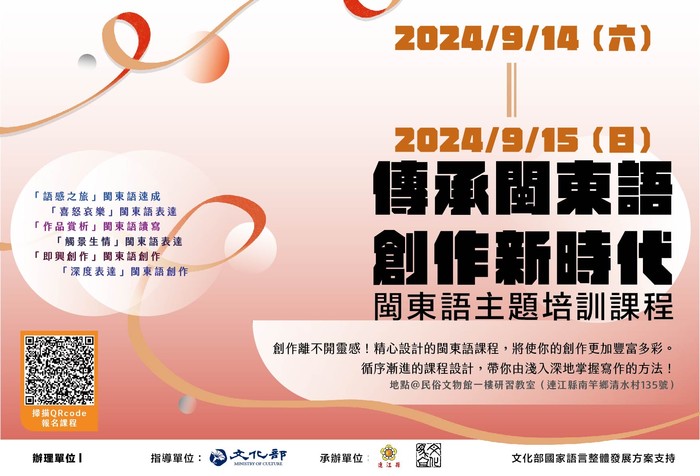 課程安排於9月14日下午及9月15日上午進行,歡迎所有對閩東語及文化有興趣的民眾報名參加。