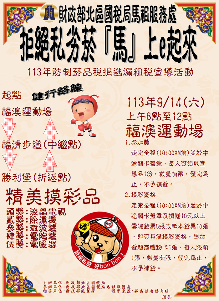 「拒絕私劣菸『馬』上e起來」健行活動 --閱讀人次 : 1337 🥳為宣導民眾勿購買來路不明菸品,以打擊非法之私(劣)菸及維護租稅公平,國稅局馬祖服務處訂於113年9月14日(星期六)上午8時,於福澳運動場舉辦「拒絕私劣菸,『馬』上e起來」防制菸品稅捐逃漏租稅宣導活動,在福澳運動場司令台前集合,歡迎大家踴躍參加!🥰