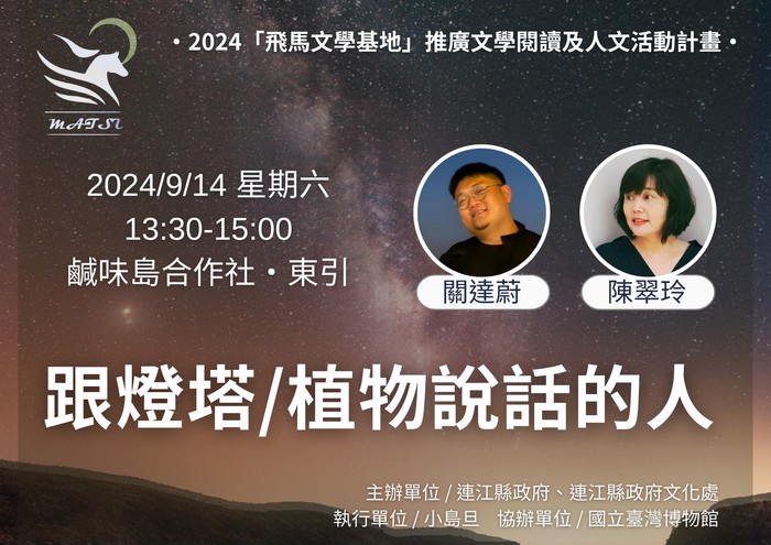9/14 飛馬文學基地講座-東引場 --閱讀人次 : 594 【2024飛馬文學基地】講座(東引):關達蔚 x 陳翠玲「跟燈塔/植物說話的人」
