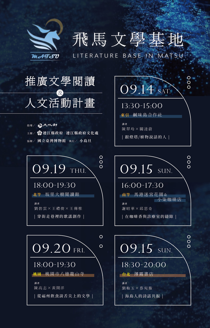 2024「飛馬文學基地」推廣文學閱讀及人文活動計畫將推出一系列文學推廣講座,邀請長期關心馬祖文學、語言與文化保存的工作者,展開跨世代對話,從迥異的觀察角度,折射出馬祖文學的多稜面貌。