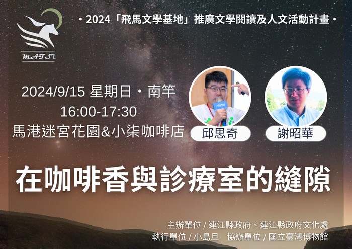 9/15 飛馬文學基地講座:南竿場 --閱讀人次 : 597 9/15 飛馬文學基地講座:謝昭華 x 邱思奇「在咖啡香與診療室的縫隙」