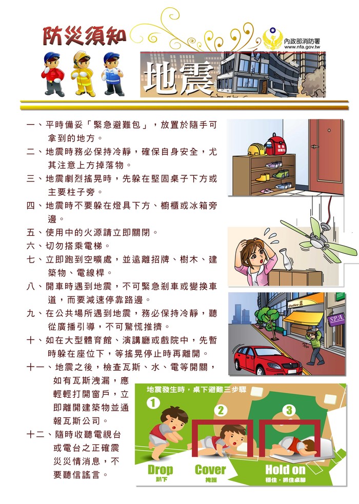 113年9月20日上午9時21分,發布「國家防災日地震警報」訊息,請立即進行自主性就地避難演練(趴下Drop【固定Lock】、掩護Cover、穩住Hold on)。