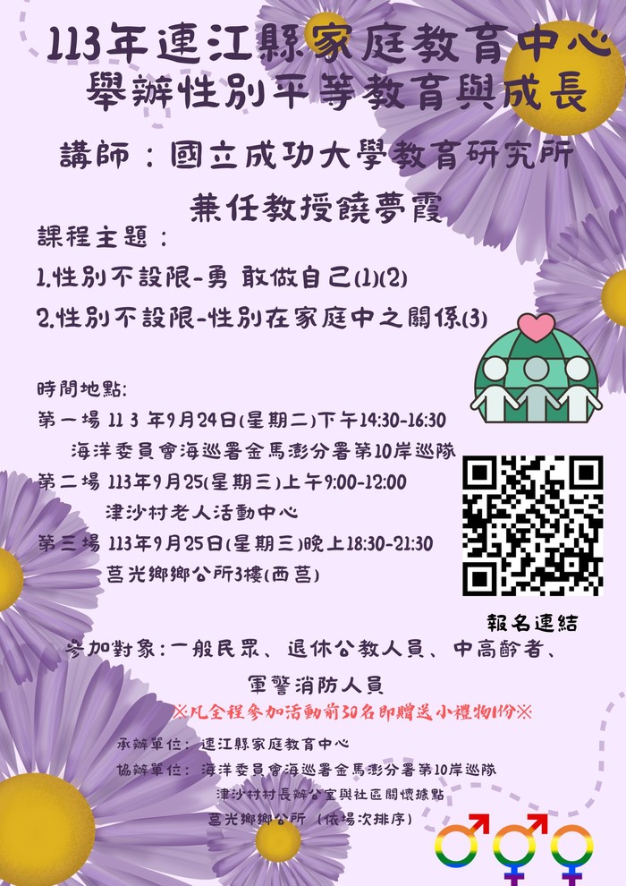 113家庭教育中心-性別平等教育與成長 --閱讀人次 : 513 113年連江縣家庭教育中心舉辦性別平等教育與成長