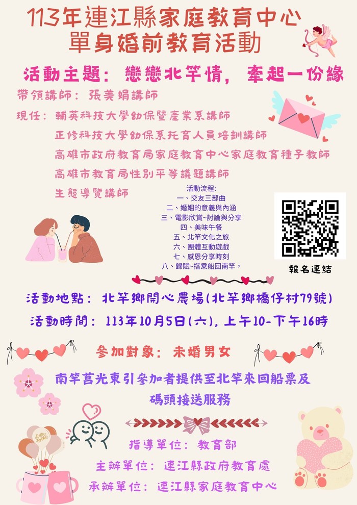 113家庭教育中心-單身婚前教育活動 --閱讀人次 : 3766 113年連江縣家庭教育中心舉辦單身婚前教育活動